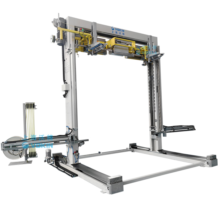 移動式打帶機可以自動尋找打帶位置并且配合打帶機底部的旋轉臺輸送機,可以完成井字型打帶,并且可短護角保護產品不被打包帶損傷。